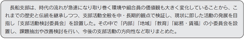 長船支部は、結成50周年を迎え、平成27年12月12日に祝賀会を開催し、こん日までの歴史と伝統を改めて見つめ直し、これまでの長船支部の精神と理念を継承し、力強く前進していくことを誓いあった。